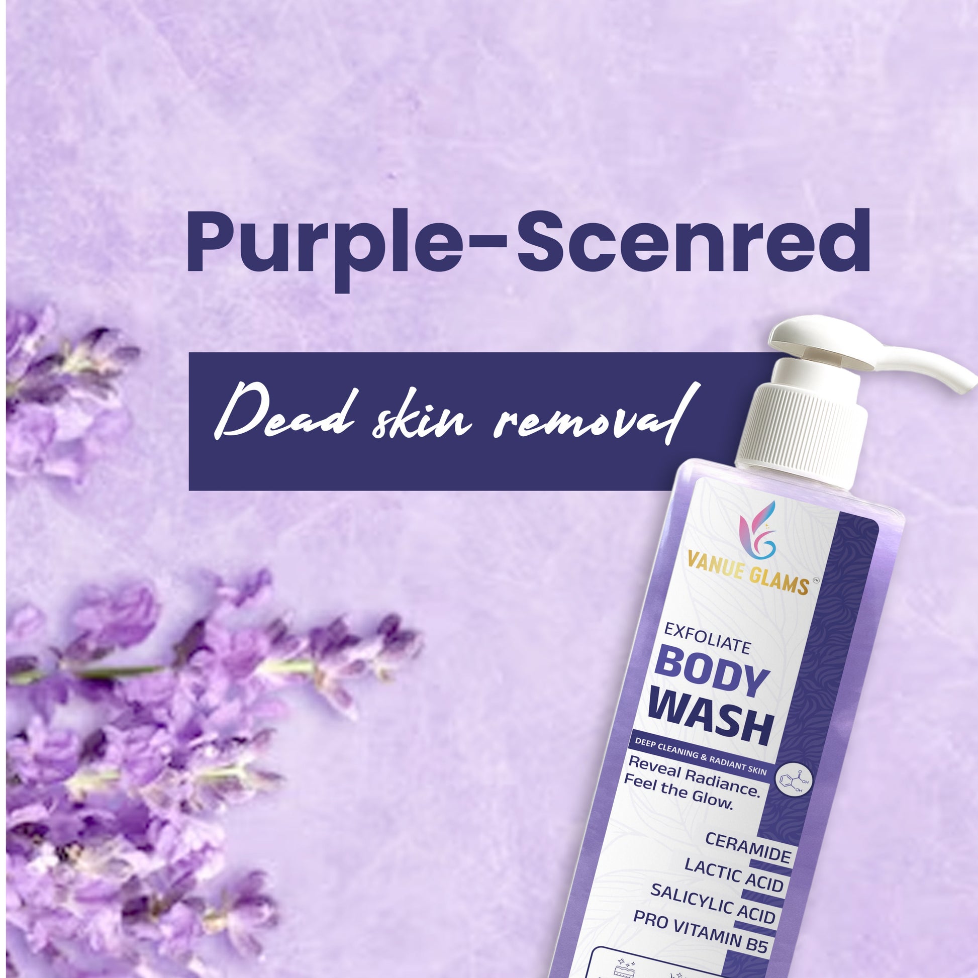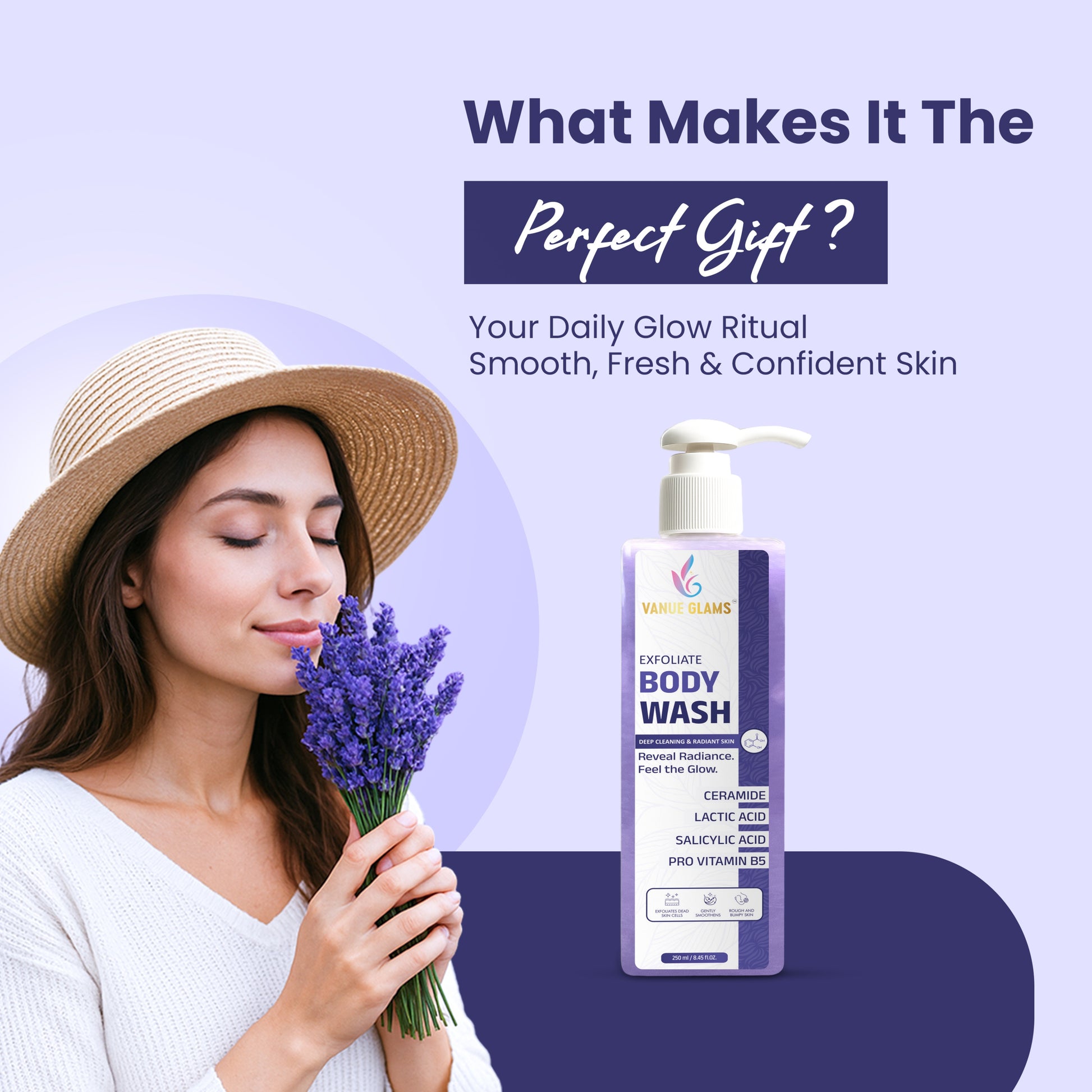 Experience smooth, glowing skin with Vanue Glams Exfoliate Body Wash. Enriched with Ceramide, Lactic Acid, Salicylic Acid, and Pro Vitamin B5, this gentle yet effective formula removes dead skin cells, unclogs pores, and restores hydration. It helps reduce body acne, roughness, and dullness, leaving your skin fresh, soft, and radiant after every wash. Perfect for daily use to maintain healthy, confident skin.