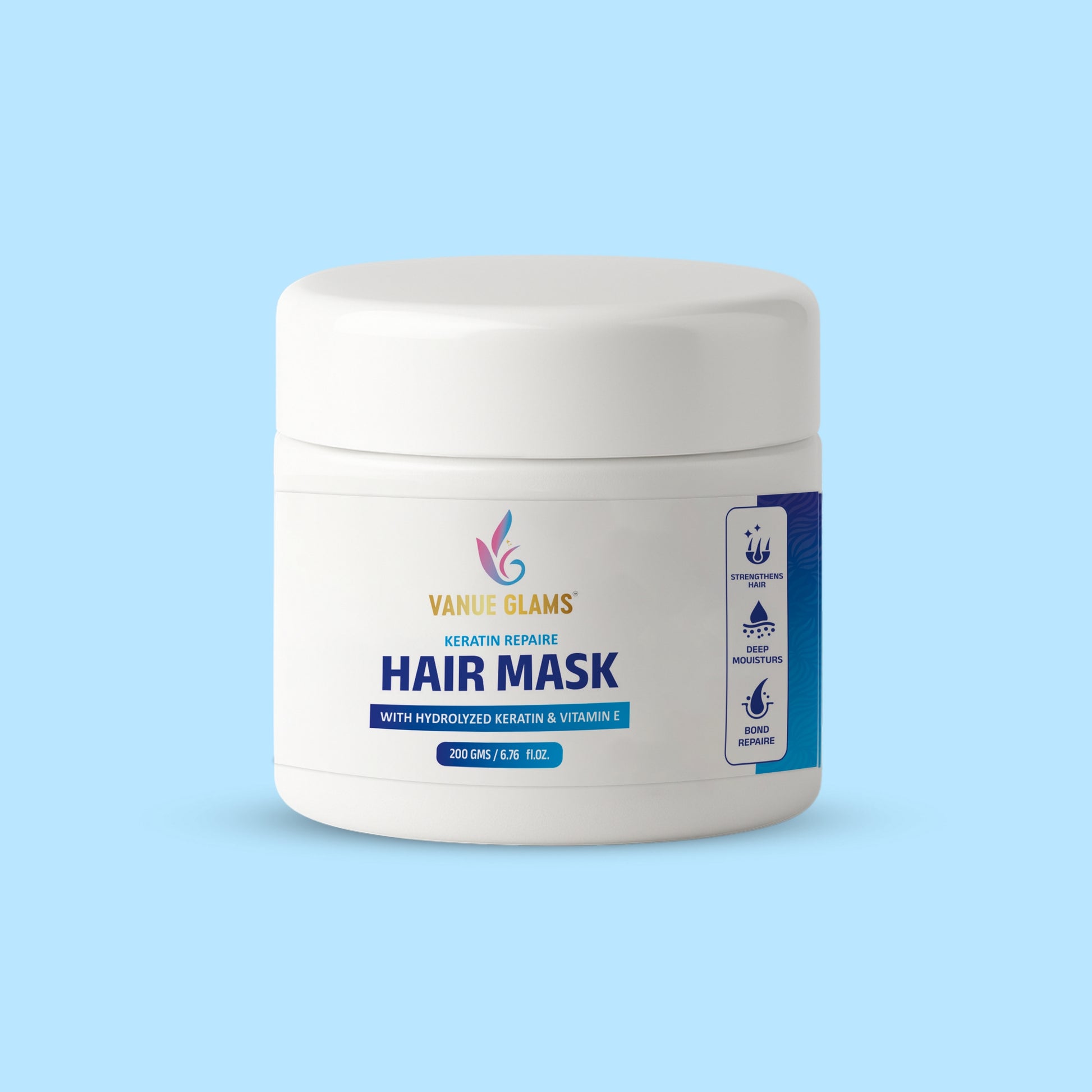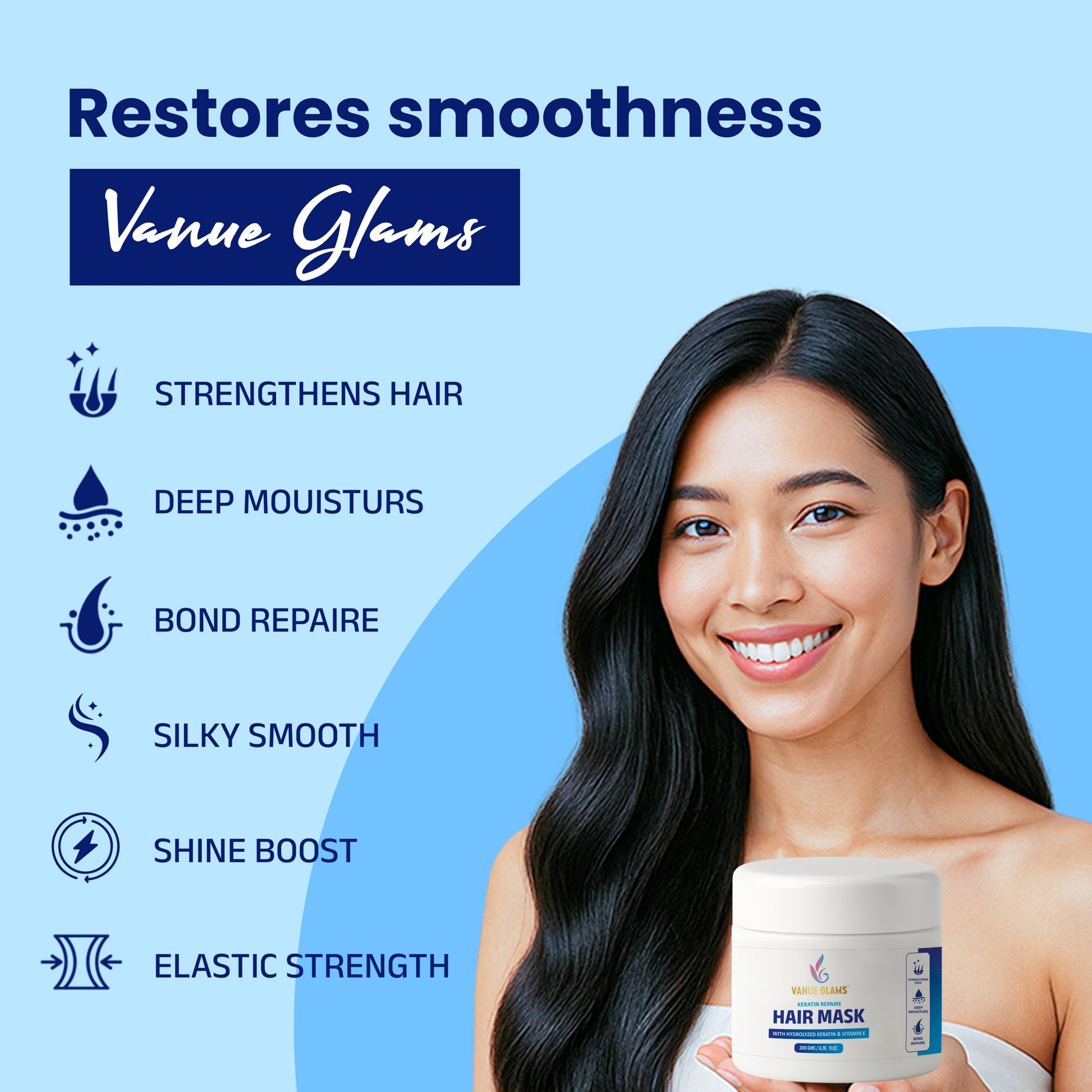 Vanue Glams Keratin Repair Hair Mask is a deeply nourishing treatment enriched with Hydrolyzed Keratin and Vitamin E to repair damage, restore smoothness, and strengthen hair from root to tip. Its advanced keratin bond repair complex helps reduce split ends, tame frizz, and protect against heat styling while boosting shine and elasticity. Curl and color-friendly, this mask provides intense hydration, making hair soft, silky, and resilient with every use.