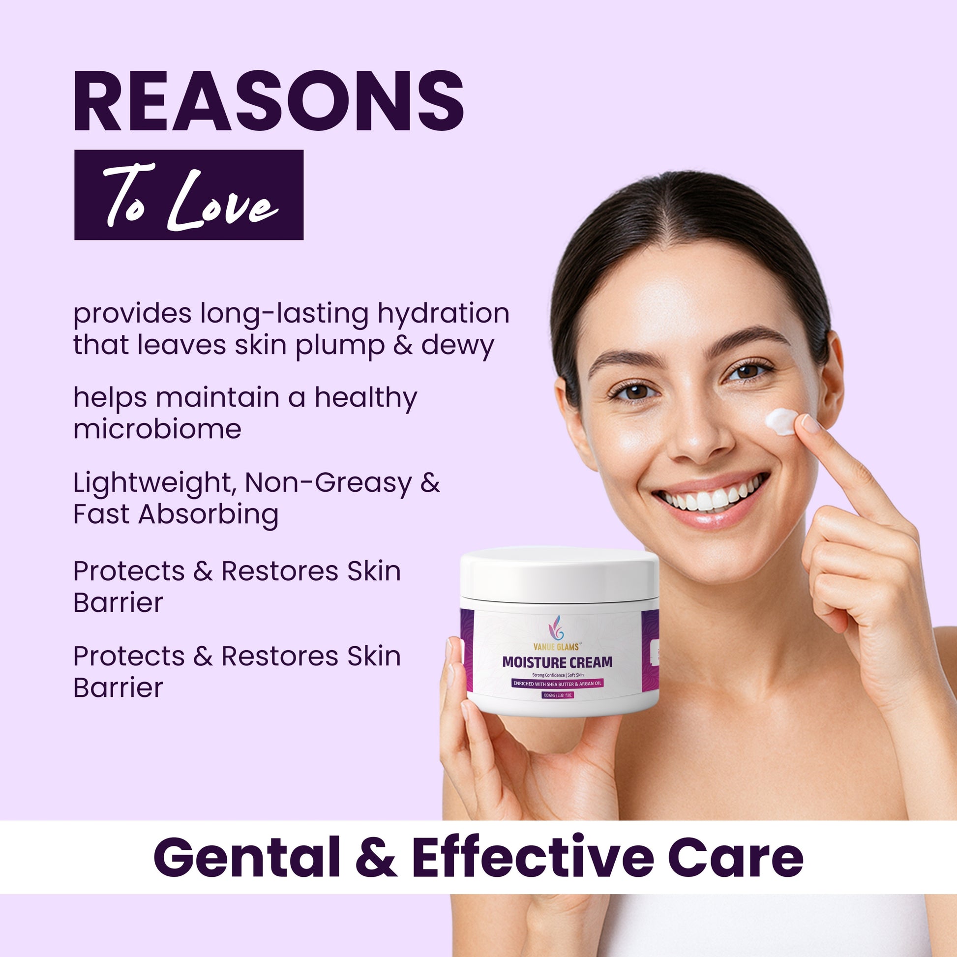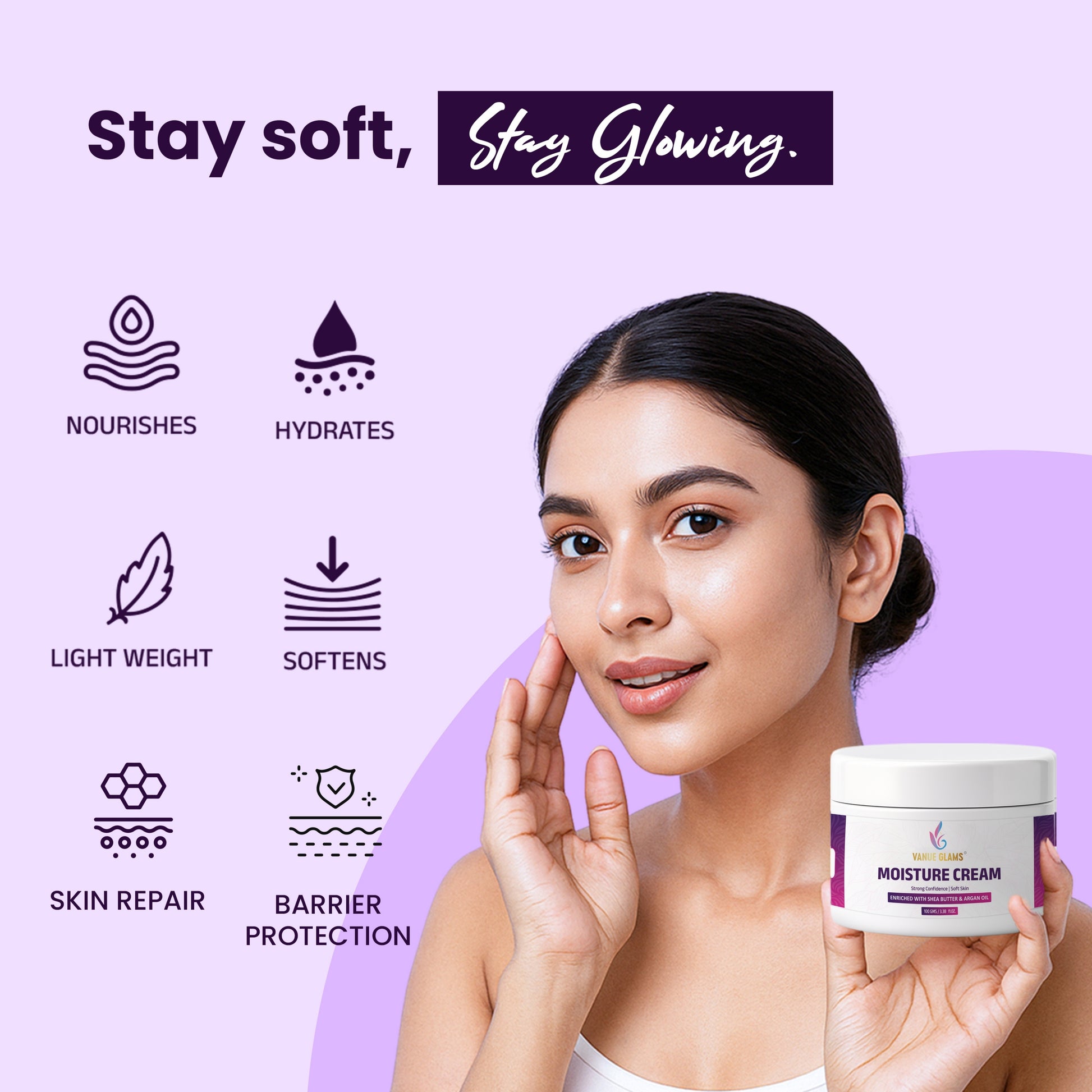 Vanue Glams Moisture Cream is a lightweight yet deeply hydrating formula enriched with Shea Butter, Argan Oil, and Glycerin to nourish and soften skin. Its non-greasy texture absorbs quickly, leaving skin plump, dewy, and refreshed. With powerful ingredients like White Beeswax and Glyceryl Stearate, it strengthens the skin’s barrier, locks in essential moisture, and protects against environmental stress. Free from harsh chemicals, this gentle moisturizer restores balance while delivering long-lasting hydration for glowing, healthy skin.