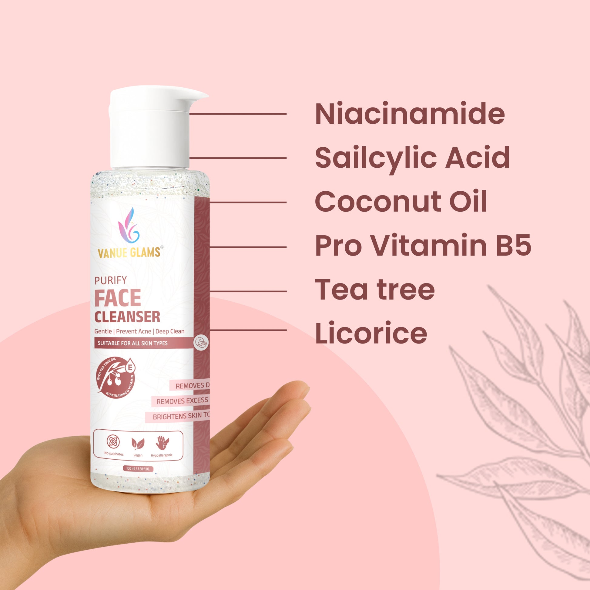 A sulphate-free, non-comedogenic face cleanser enriched with Niacinamide, Salicylic Acid, Tea Tree Oil, Coconut Oil, Pro Vitamin B5, and Licorice Extract. Specially designed to gently cleanse, prevent acne, remove excess oil, and brighten skin while being suitable for all skin types including oily, dry, combination, sensitive, and normal skin.
